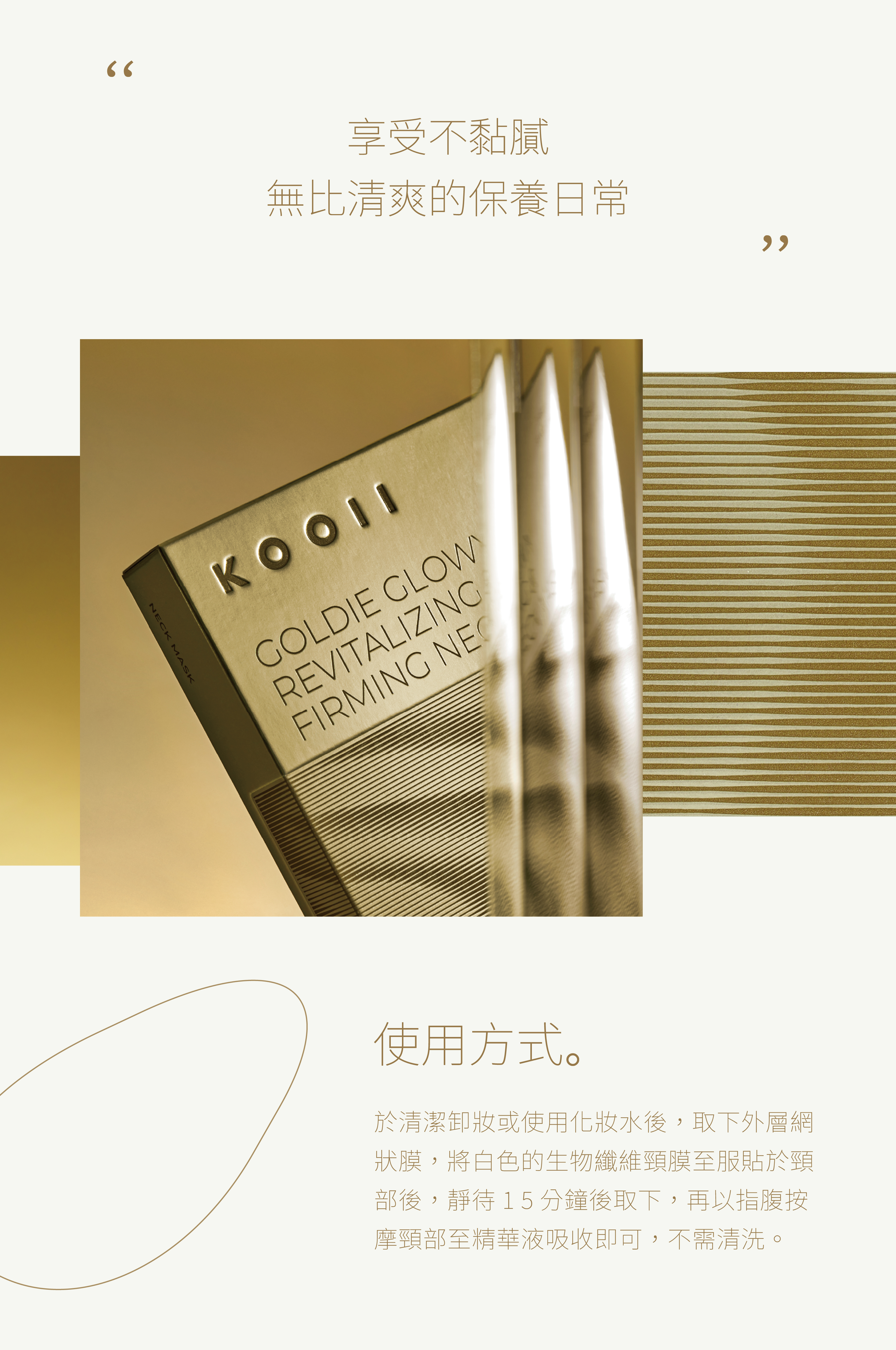 清潔肌膚後,取出面膜敷於頸部肌膚。15-20分鐘後取下,輕拍吸收後再上後續保養品。