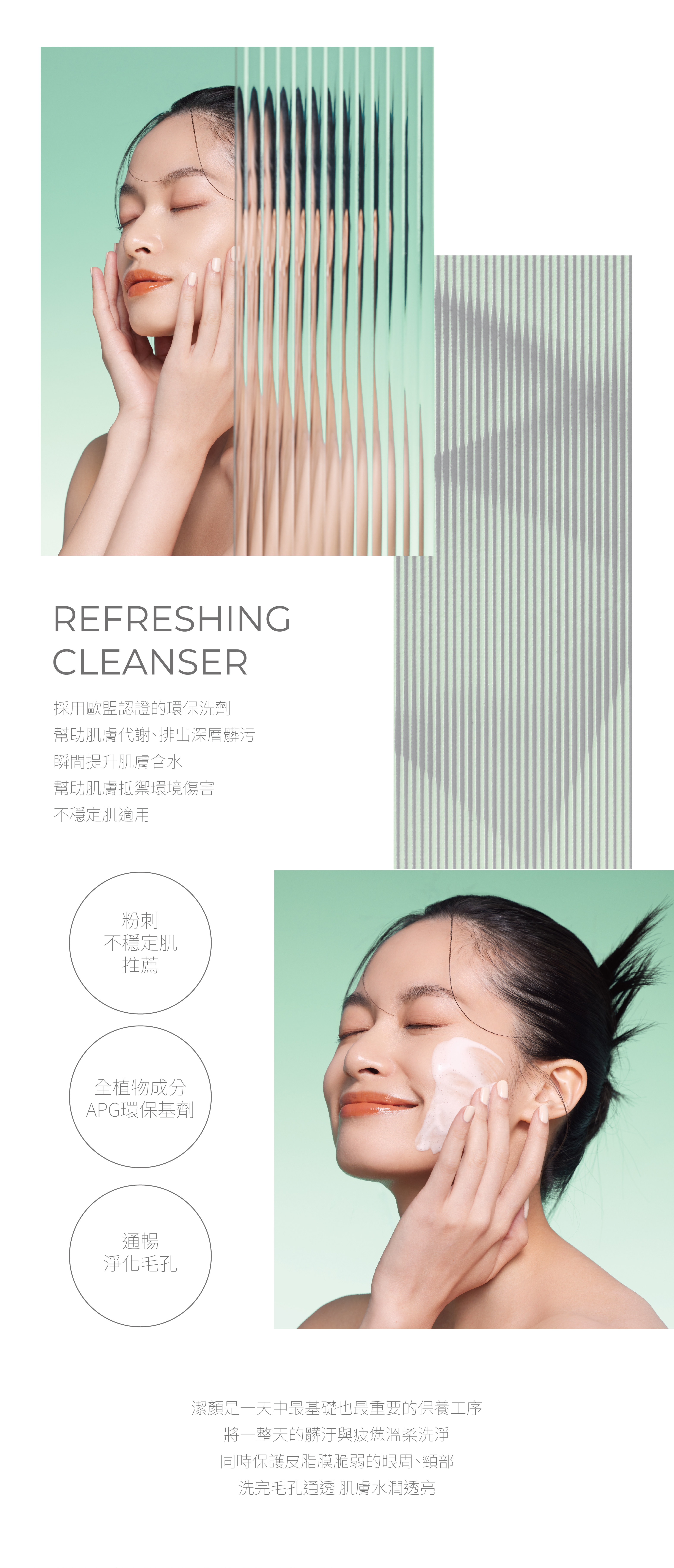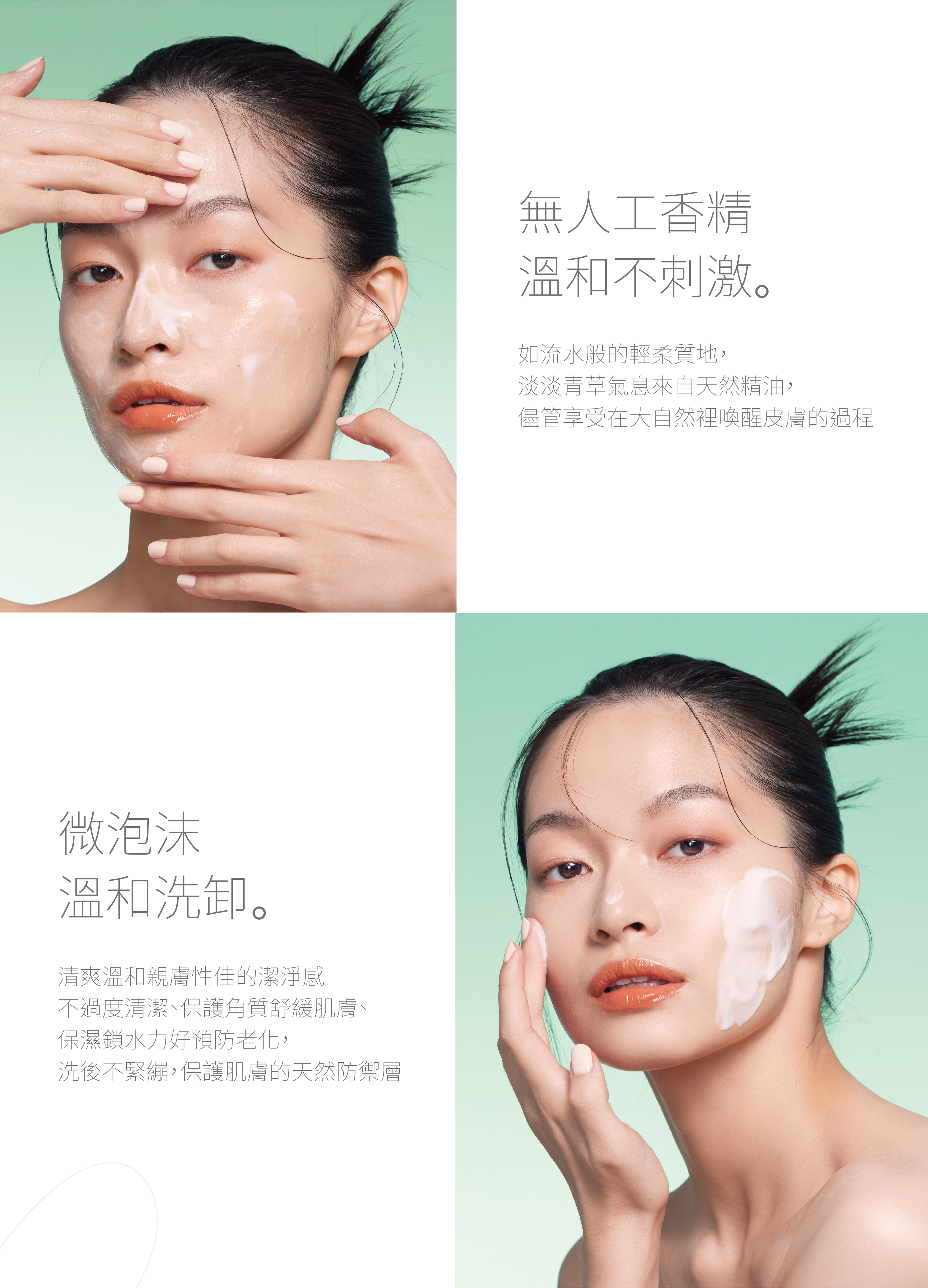 微泡沫的溫和洗卸,洗後不緊繃,保護肌膚的天然防禦層。如流水般的輕柔質地,淡淡青草氣息來自天然精油。採用歐盟認證的環保洗劑,幫助肌膚代謝、排出深層髒污,不穩定肌適用。提升肌膚含水,幫助肌膚抵禦環境傷害。