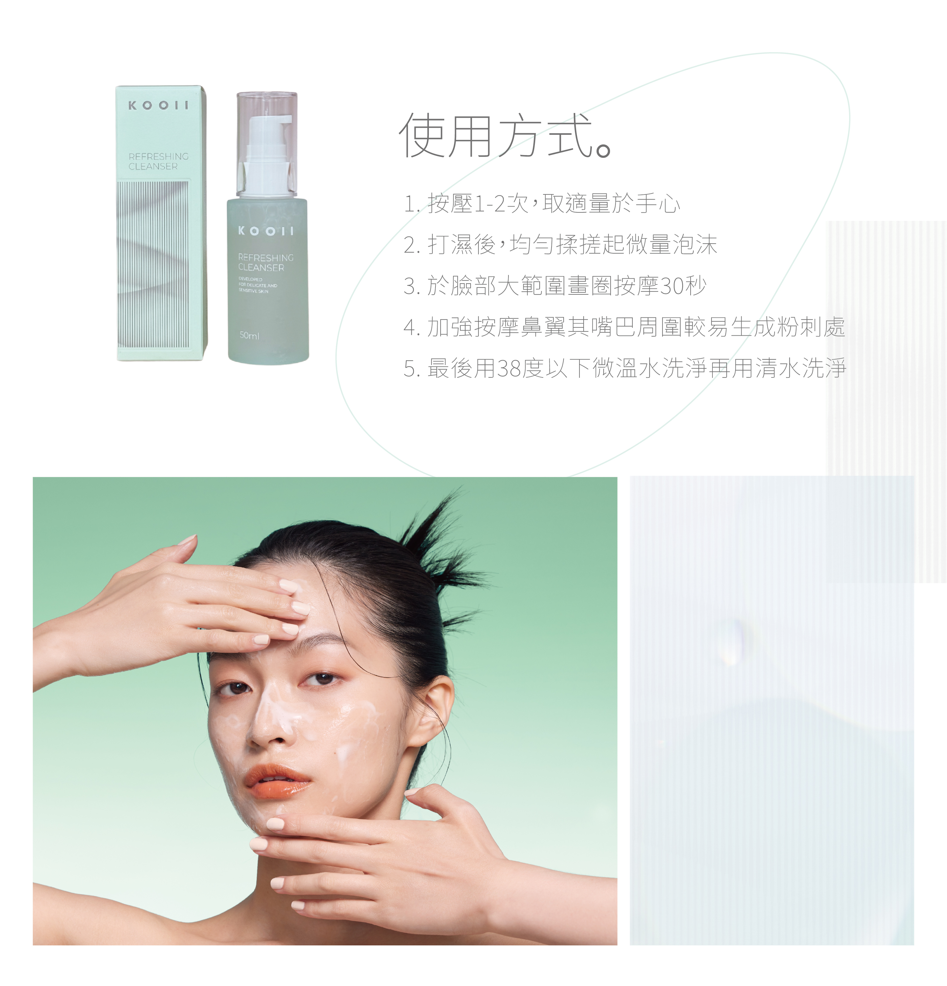 第一次清潔:按壓一到兩次,加些水輕輕搓出微泡沫,於臉部大範圍畫圈按摩30秒。