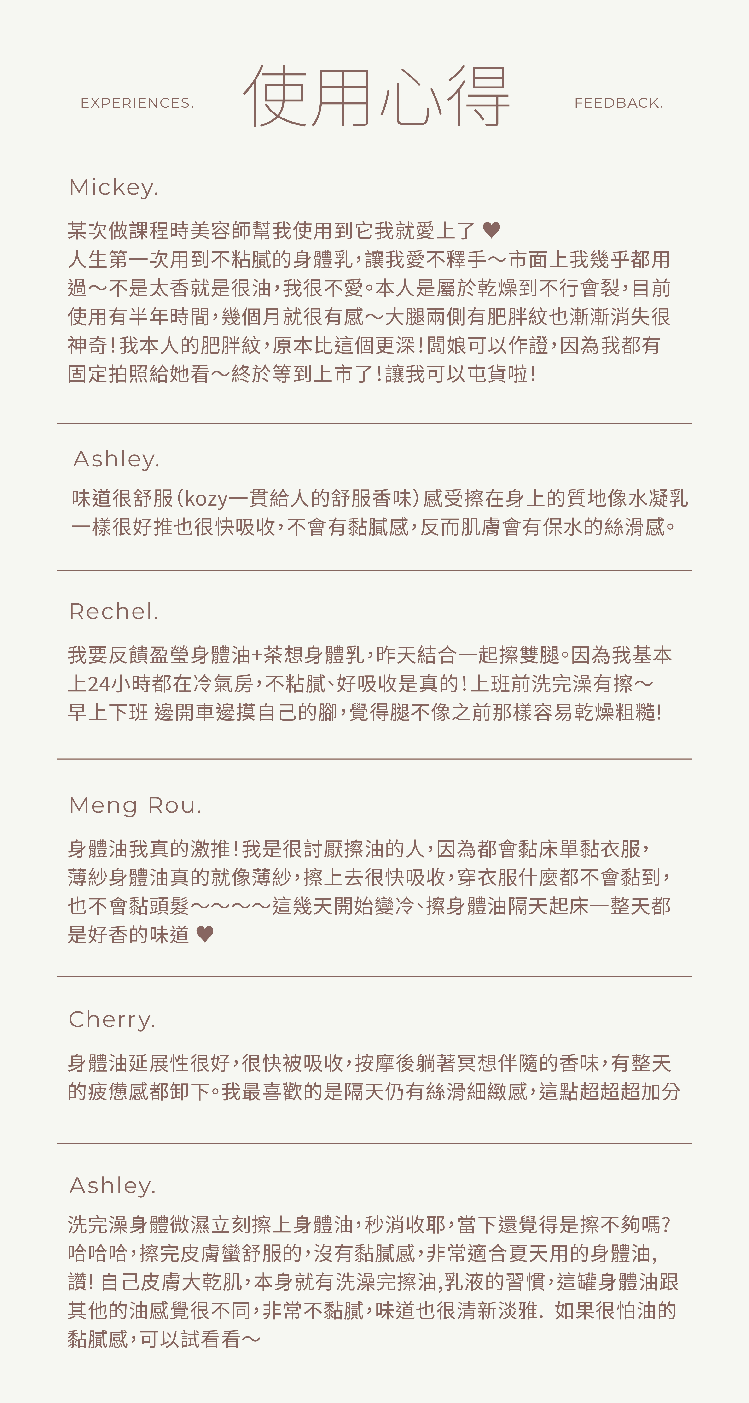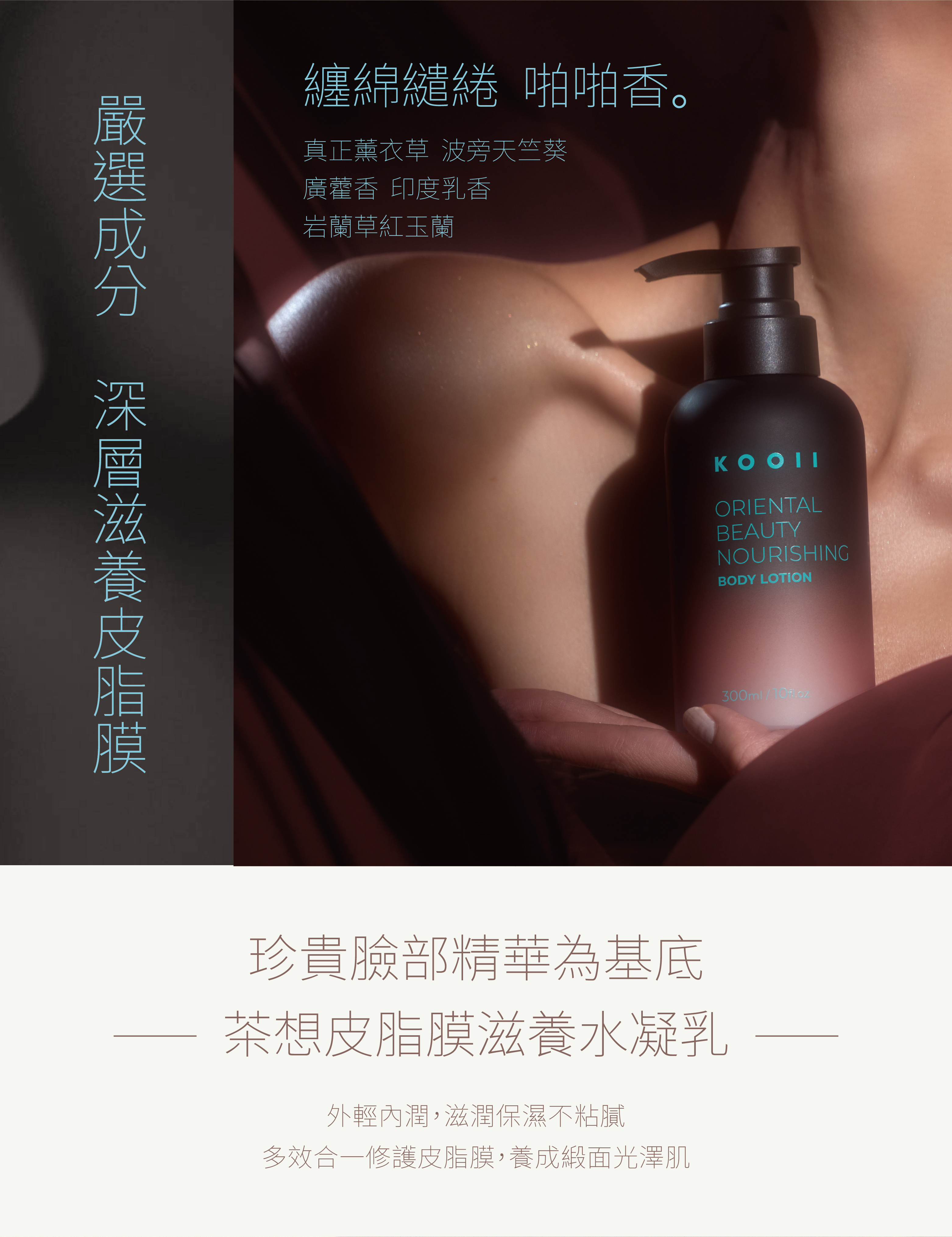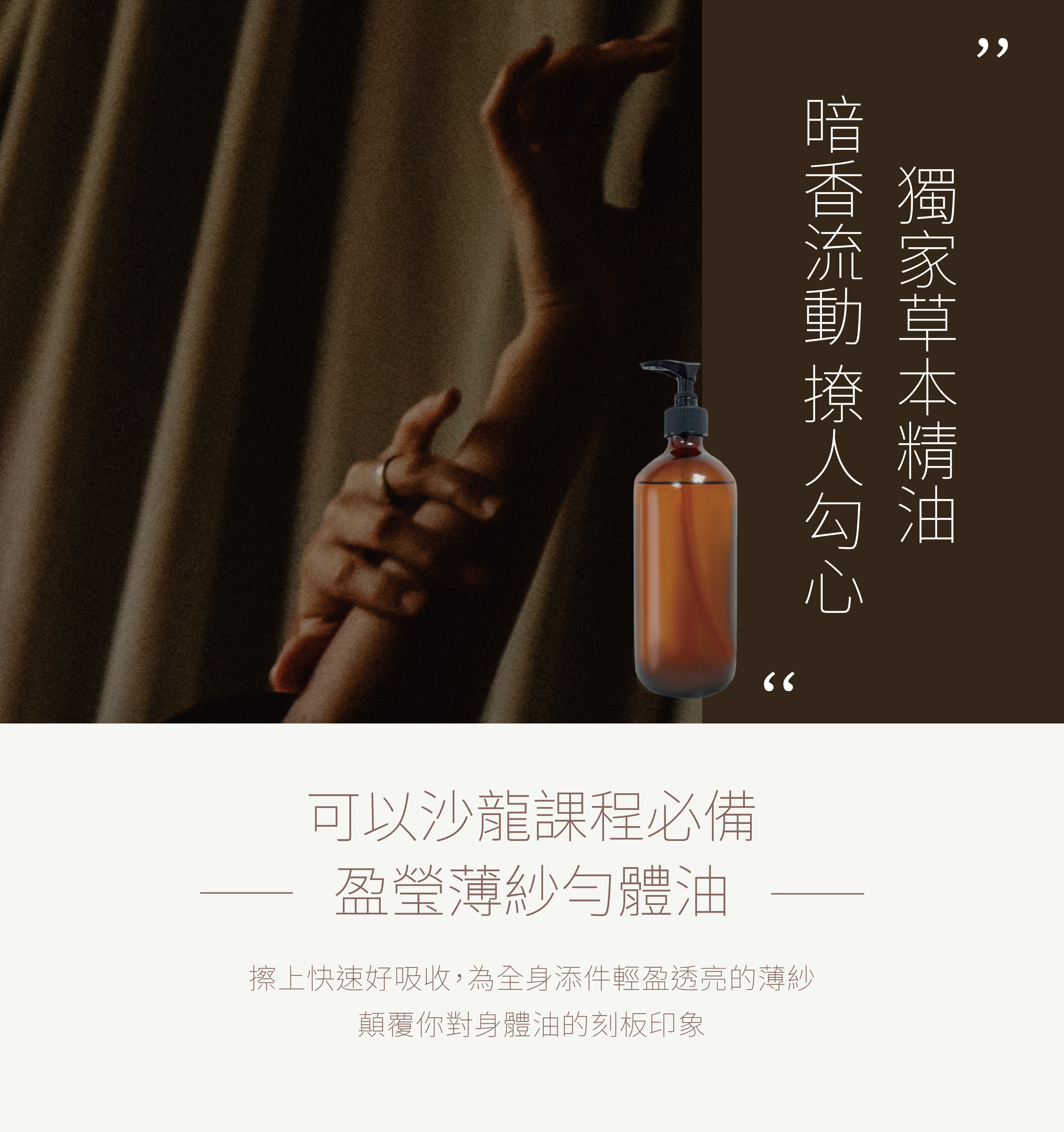 居家保養首選,深層滋養如輕盈的第二層肌膚。搭配獨家草本精油暗香流動,撩人勾心。