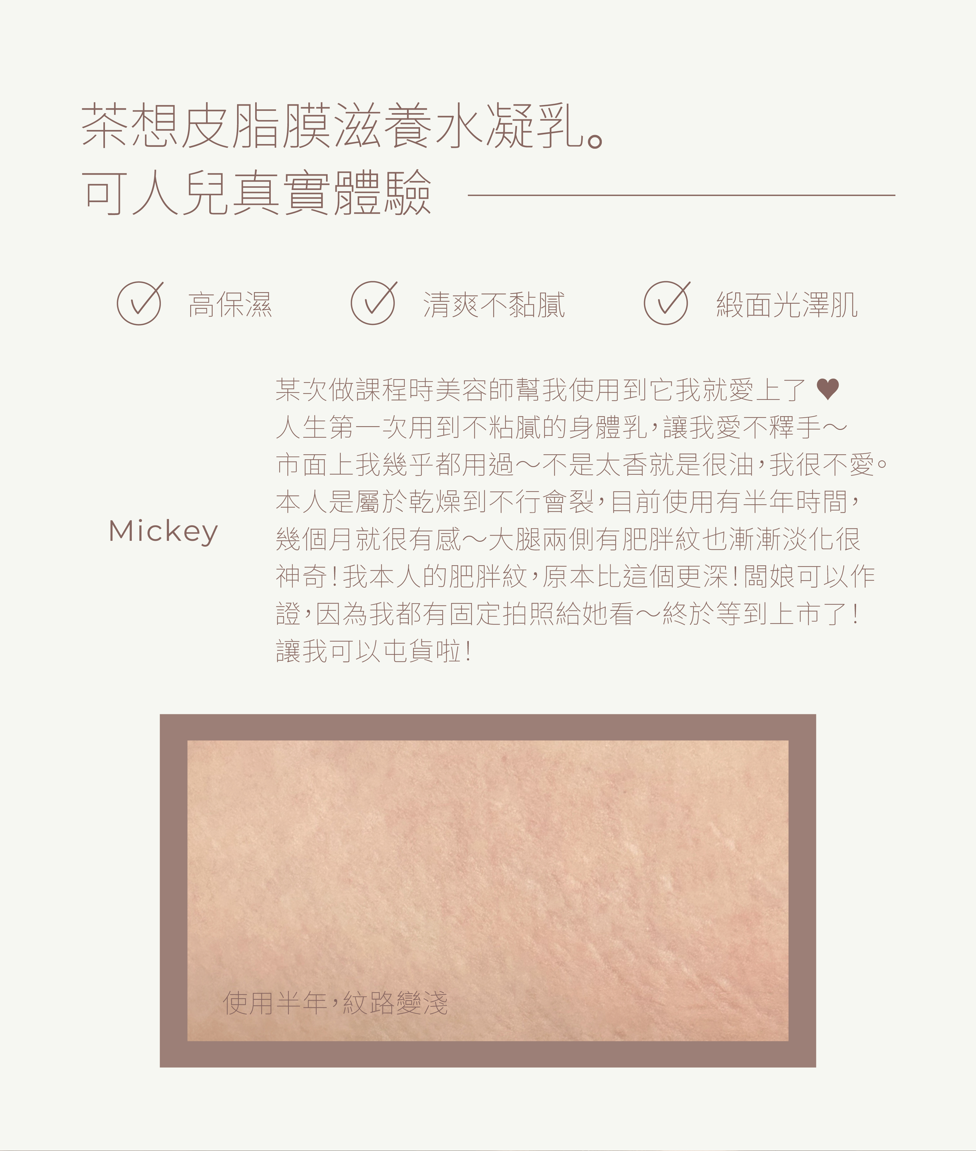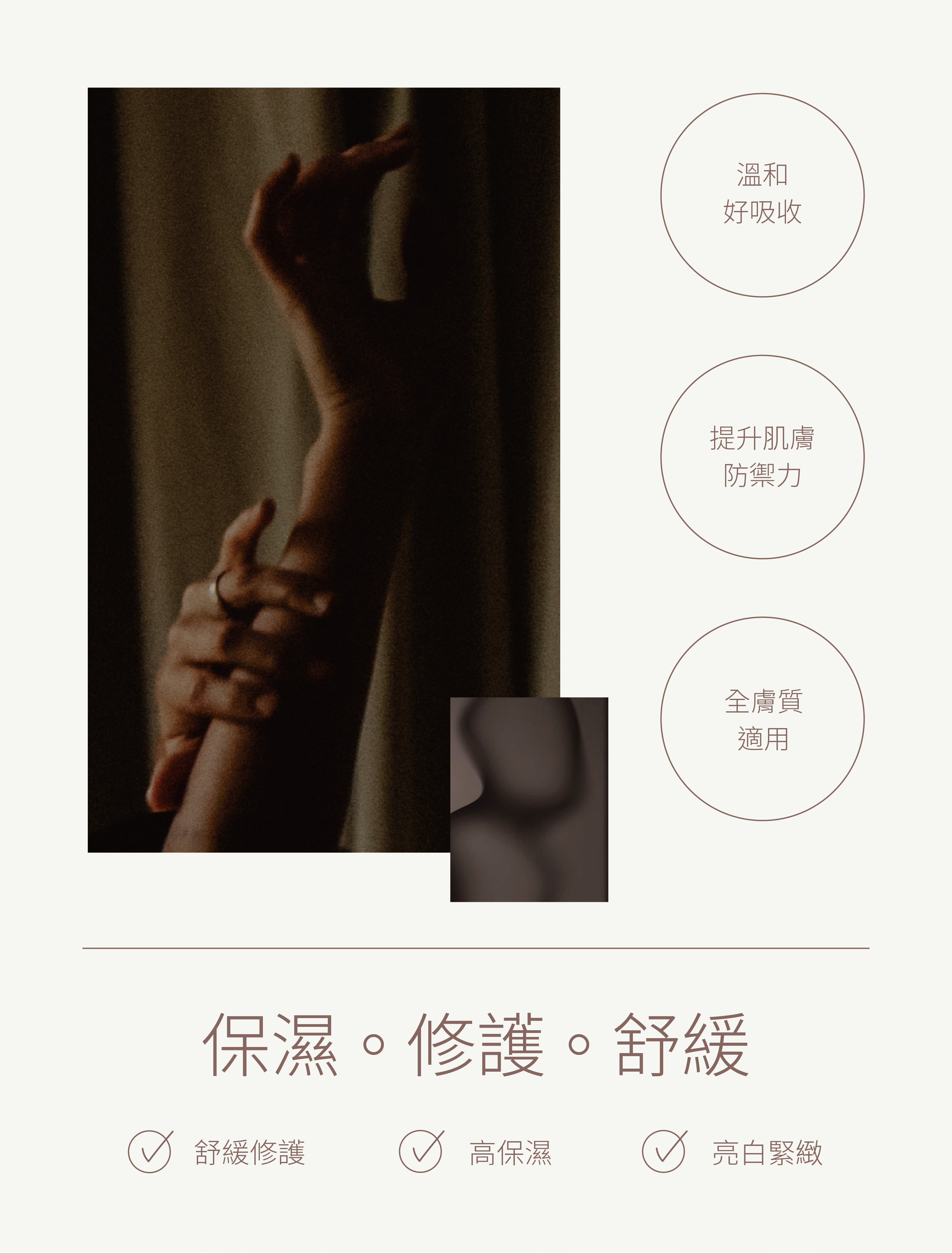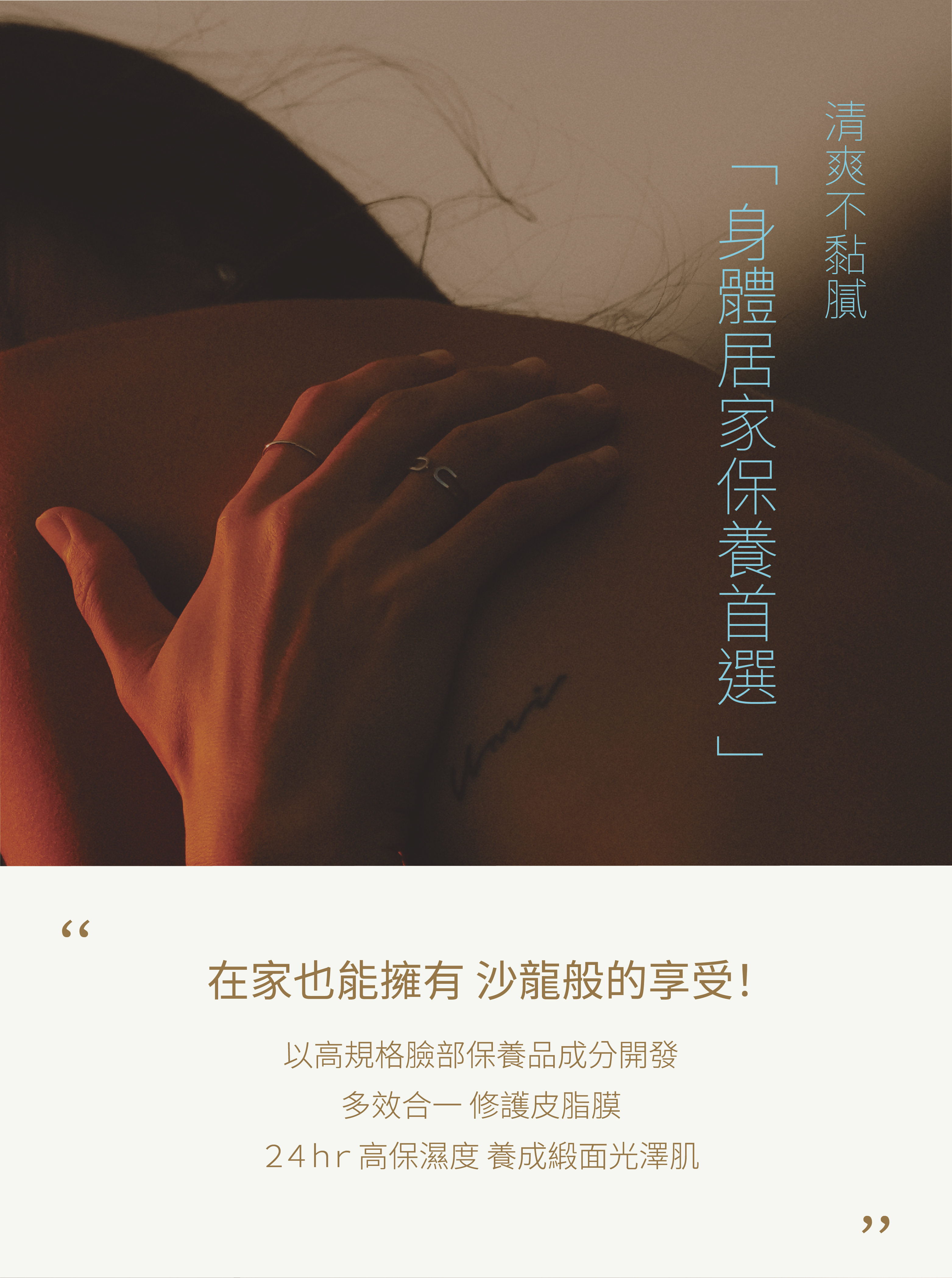 溫和好吸收,滋潤保濕不黏膩,塗抹全身綻放自然亮澤。