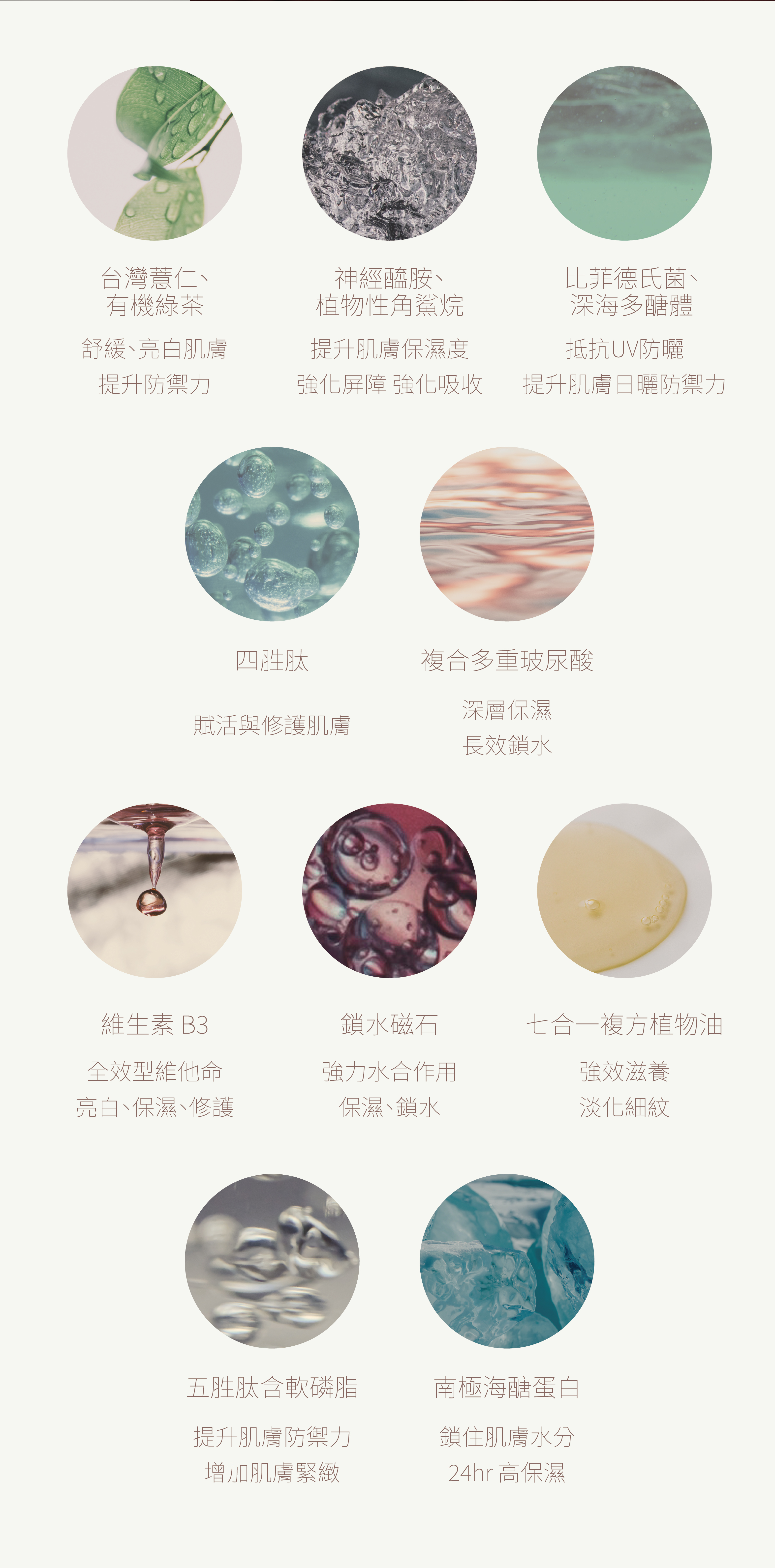 內含台灣薏仁、有機綠茶、比菲德氏菌、舒緩四胜肽、複合多重玻尿酸...等,